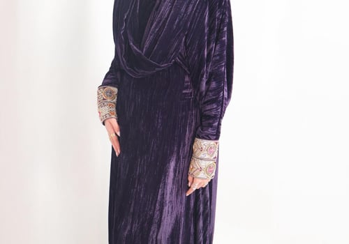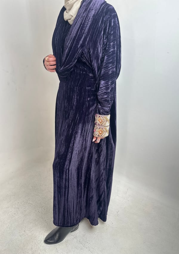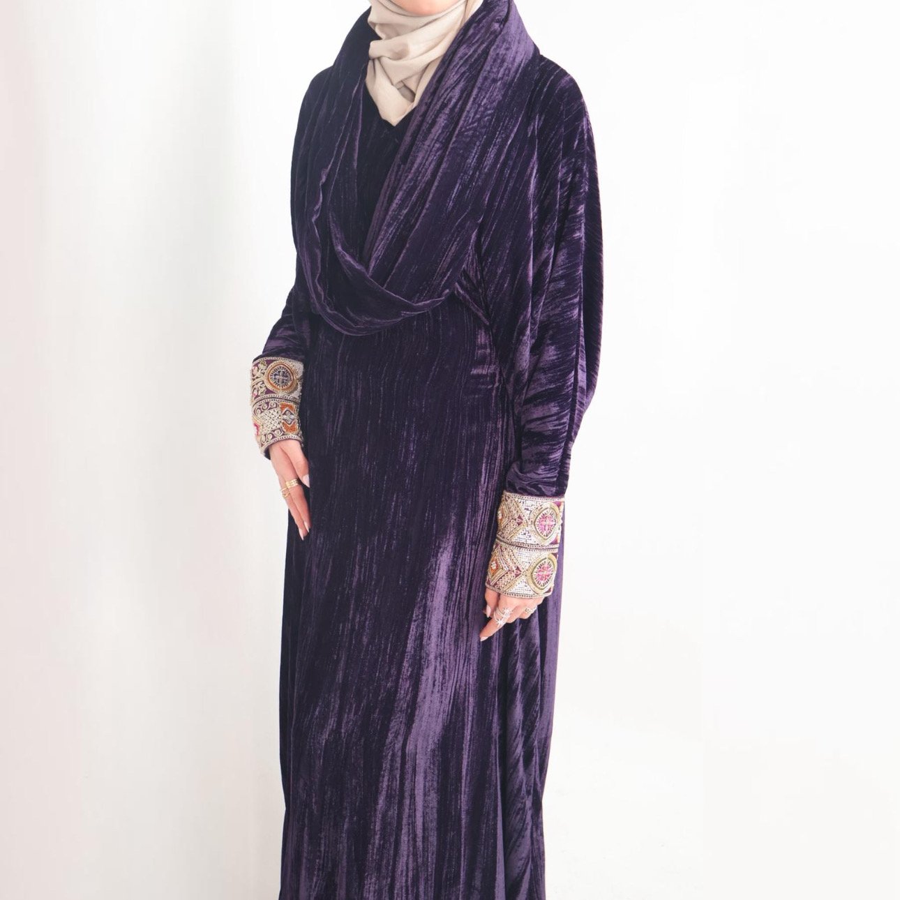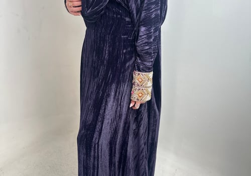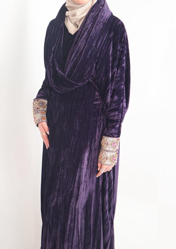 Velvet Daraa Free size Features an adjustable inner belt for a customizable fit Sleeve length can be tailored upon request The scarf is attached to the daraa